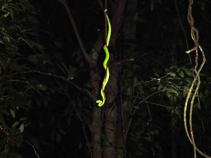 We stayed in a guest house that sported ten acres of rain forest to peruse. In numerous walks we saw Pizotes, Agouti, Army Ants, Mot Mot birds, Toucans, and many birds we could not identify. Our host Dulce, took us on a night hike, where a viper almost got us. At night I usually spend so much time looking at where I’m stepping. I did not think to look up for vipers hanging from vines. Thankfully Dulce knew better and stopped me from running into this viper which was about head height.