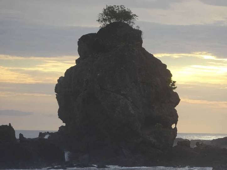 They also pointed us to a local attraction at the north end of Ostional beach: La Punta Indie. Local young lovers like to hike the point. The story goes that a young indigenous man fell in love with the princess of a god. As punishment, the god whisked the maiden away. The young man with a broken heart, looked toward the sea until she returned. When the angle is right, the rock formation looks like the head of a person. The hike went over crab laced beaches and over tide pools and rocks. We climbed to the “eye” of this formation at sunset to see through his eyes.