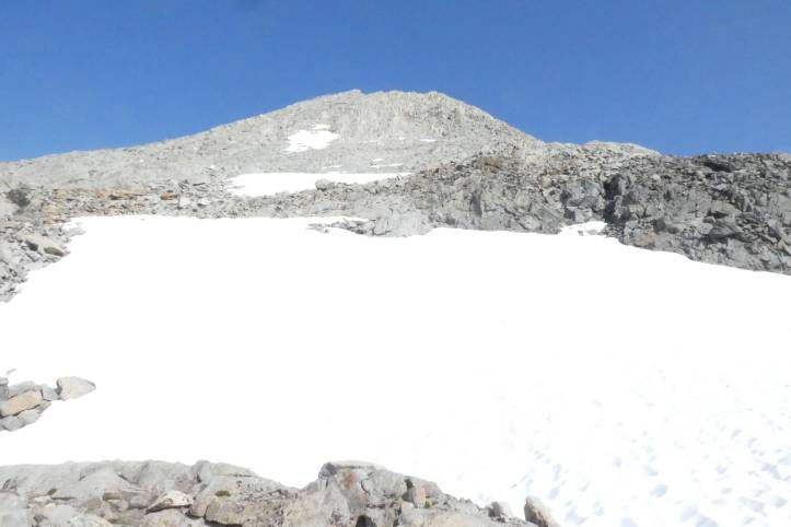 My socks didn’t dry and my shoes were still wet. So my day started by putting on cold wet socks into colder shoes. Temperatures dropped below freezing during night the so the tiny puddles around my tent were iced and my shoes crackled as I put my feet in them. My camp was at the confluences of the tree and snow line. Within minutes of wolfing down some red beans and rice and starting day, the trees were disappeared and the snow fields started. I walked to the edge of a rock outcropping to survey my direction. It seemed pretty straightforward. Mather was in the distance perhaps a mile or two, and a series of snowfields. Two JMT hikers passed me on the snow field. The first was someone from England who claimed he had a flight to catch and had to make it to Yosemite by 7/15. He was on a schedule. Some PCT hikers passed me in the snow field as well.