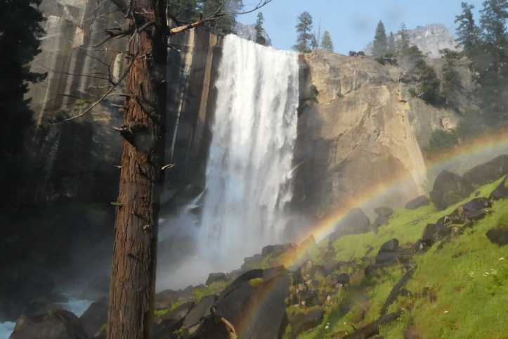 I sped down through the forested areas to the JMT junction. The rain and snow had clearly eroded much of the trail from my last visit. Instead of dirt path, it was mostly rocks that I had to navigate. I sped past people, leaping from rock to rock, using my poles to keep me balanced. The sand in little Yosemite slowed me down. I took the Mist Trail shortcut to get down faster. To be clear there was no hurrying here. The trail was steep, and for whatever reason, I got disoriented. I found my self at the Vernal Falls headwaters. I had been moving a solid clip and needed a rest. I dunked my head in the waters and had a bar. I couldn’t make sense of the map I had, but I continued down and captured one of the most amazing shots of my trip: