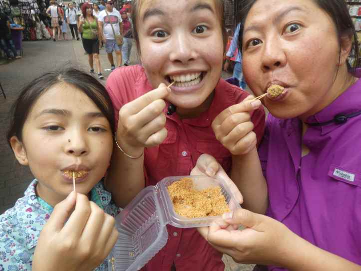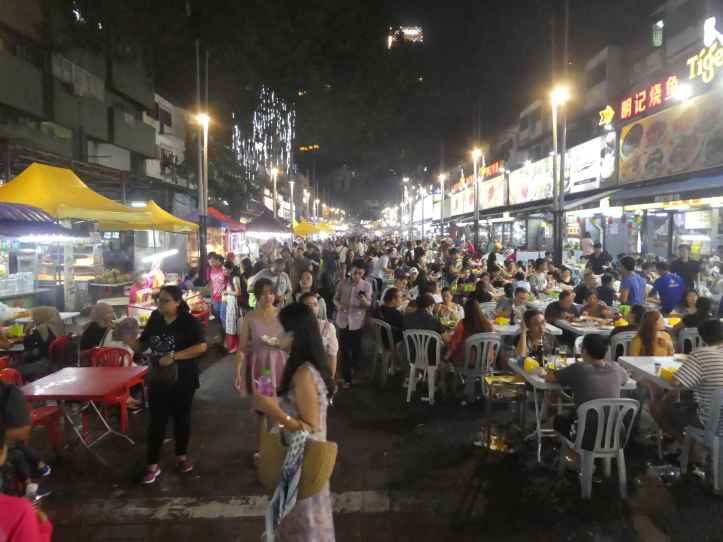 Street food was an apt description, but the connotation didn’t match for the Jalon Night Market. This street was open 24 hours for all to enjoy. Restaurants lined this two-block stretch. The restaurants put tables and chairs all the way into the street allowing just enough room for a single car to pass or during busy hours streams of people walking up and down. Some street vendors also took spots where tables did not exist and put out some stools and tables of their own. There was very little merchandise and a whole lot of food. Durian and lesser fruits, juice stands, Chinese, Thai, Malay, and Indonesian food restaurants and food stalls line the streets. Throngs of people pour up and down the street. Touters called: “Hello Hello, come see. Come eat”, they rang bells, they put menus in our faces. Everyone was vying for our attention and our Ringgets. Hawkers went table to table. People sang and played guitar for money. While authentic Malay food could be found, it catered mostly to tourists from all over.
