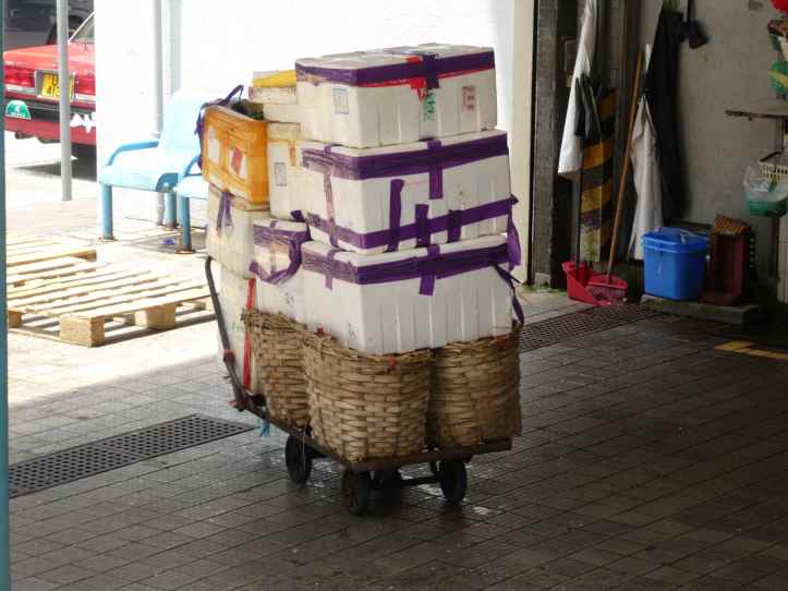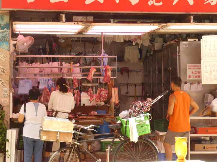 Another interesting contrast was a commitment to old style single proprietor ownership. Rather than a giant retailer like Walmart or Costco, there are hundreds of small shops, single restaurateurs, and booths that sell the same thing, just not in bulk. Just down the street from where we stayed was the Kwan Chung Market three story market that sold poultry, beef, pork, fish, and all things that needed to be cooked. Instead of one store, there were hundreds of individual proprietors, each equipped with their mini walk-in freezer for them to keep goods until the next opening. Giant slabs of wooden butcher blocks with deep depressions worn by time and use were in front of many shops. There was no AC here, and most male proprietors were shirtless. To cool off, they’d put a wet rag in their cooler, take it out, and put it on their head. I wondered about the trade off between big box store employment versus this style of allowing many self-proprietor merchants. This represented a different view of how capitalism could work in an urban landscape.