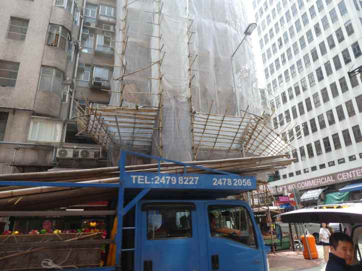 There are many juxtapositions in Hong Kong. A favorite of mine was the bamboo scaffolding. In this very modern city full of technology and neon light, there is constant building — constant replacing of the old and dilapidated with newly repaired items. To do so, giant bamboo scaffolding is erected around that which is to be modernized. The bamboo is laced together and set on the ground. Sometimes the scaffolding goes up many stories.