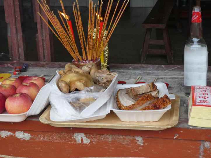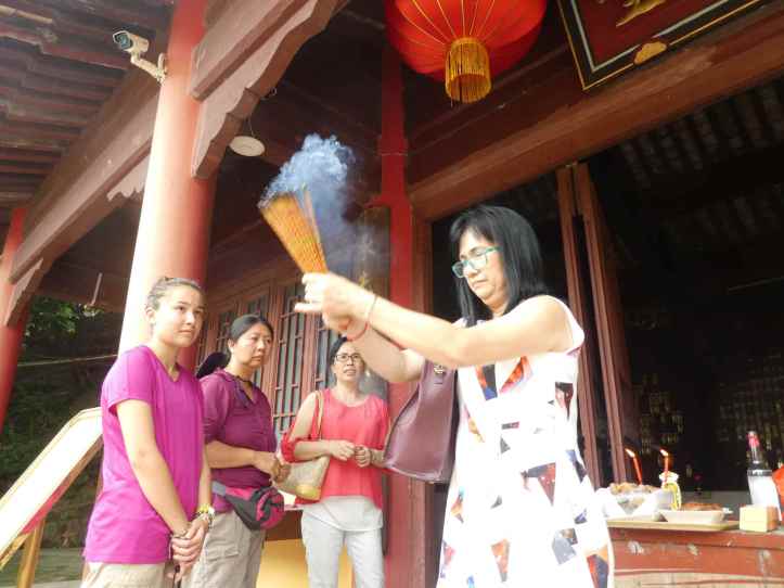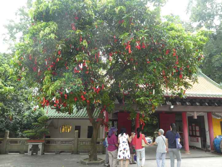 Part of visiting family is paying respect to ancestors and family members who have passed on. This tradition in Cantonese is called Bi-San. In the dense humid air we walked to the temple within the Guifeng Mountain Forest Park. A beautiful gold pavilion that was being renovated attracted everyone’s eye before going into the temple’s interior. Upon entering the main door, we were greeted by a giant tree full of red ribbons. It was explained that you make wishes or resolutions and throw the ribbon into the tree (or hang it), for the wish to come true.