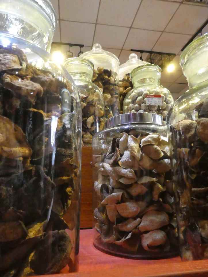 As we drank thimble sized cups of tea, young girls would walk in and out delivering different “products” to try out. There was a orange peel infused chocolate nut. (I didn’t like that one). Orange peel infused black jelly. Orange peel infused sunflower seeds, plum candy. An orange peel infused life-saver-like breath mint. “We use this after drinking the Chinese herbs that are bitter. It erases the bitterness.” The flavor exploded in my mouth and the flavor stayed with me, much like that of an antiseptic mouthwash. The pace was fast and furious as Kylie could not stop shoving all the yummy things in her mouth, to the delight of the sales people. In gratitude to her Aunties, Sharleen bought each a bag of chanpi sunflower seeds.