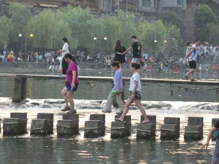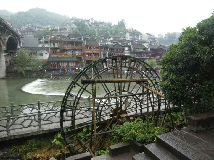 The ancient town, which was built up during the Qing Dynasty (1600-1900), lies riverside. Waterwheels line the rivers edge. Periodically a giant stone bridge, small wooden planks, or giant stepping stones allow people to cross from one side to the other. Stone houses propped up with timber and bamboo line the riverbank. The streets are made of large pieces of carved stone pieced together. They are chipped and worn from use. Crooked and curving alleyways veer off at irregular intervals.