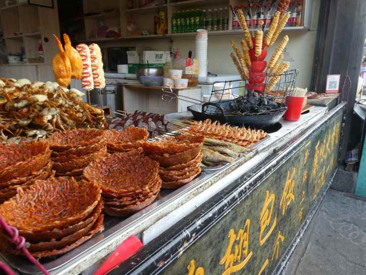Shrimp bowls, skewered crabs and fish sit beside blackened stinky tofu. |