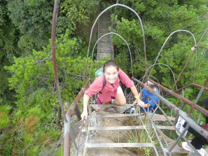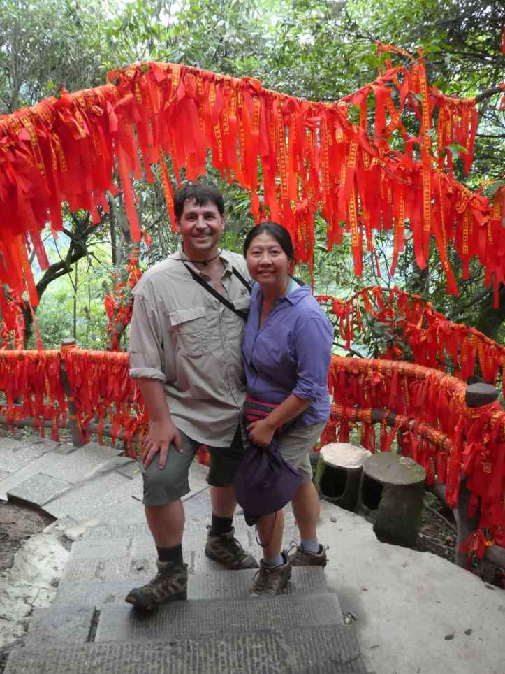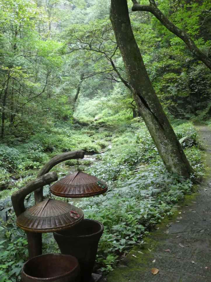 We came to a fork in the road and chose to go into the Shadao valley.  This valley was right below the overlooks we were at early this morning.  The dense green foliage, mist, and humidity made the walkway more and more difficult.  Alyssa and I slipped several times. Alyssa observed: “Dad, I really like how convenient they make it to throw stuff away.”  It was true, every 50 meters or so on every path, there were these small garbage cans.  It was a simple observation, but there were so many lessons in that.  “That is good design practice,” I explained.  “More than that, it provides extra employment.  Someone walks these trails every day and empties those out.  It helps with the Chinese model of full employment.”