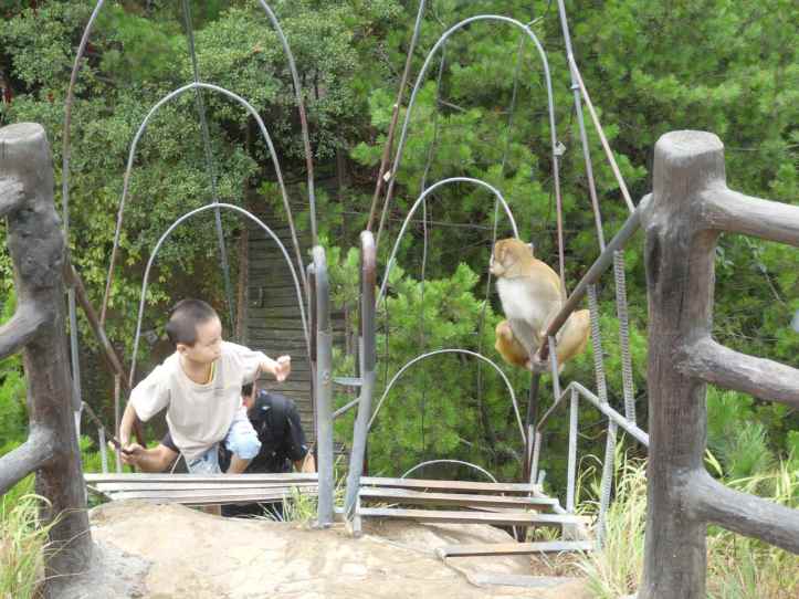 Beaming with joy on the way back through narrow paths with sheer drops on either side, we spotted a grandma selling peaches.  She huffed it up, except with a sack of peaches and cucumbers for sale.  We couldn’t pass it up.  When a cheeky macaque tried to sneak up to grab her food, she quickly grabbed a stick and instantly the macaque bounded off down the cliff to the refuge of some trees.  Don’t mess with this grandma!