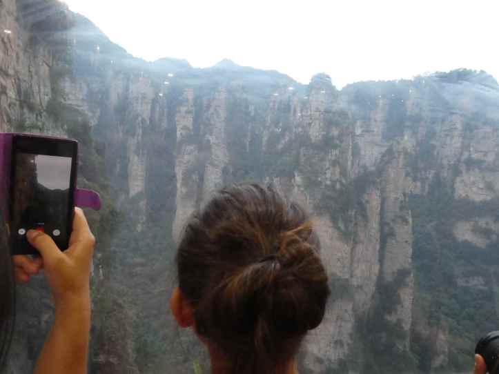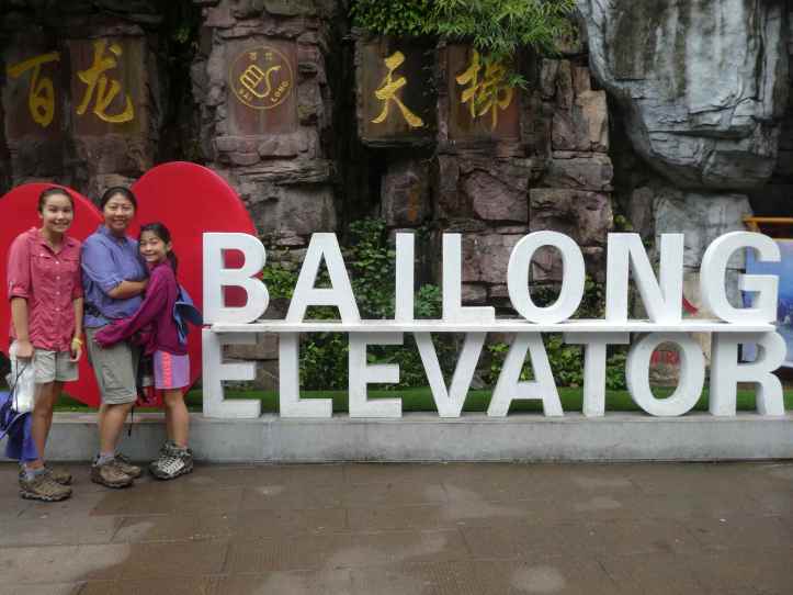 To beat the teeming masses, we dragged ourselves out of bed again extra early and headed for the park entrance — number 2 in the line again.  Some other travelers traded tips with us, preparing for our full day of no rain in the park.  Our anticipation built as the clock ticked down to 6:30AM.  We felt like race horses chomping at the bit.  The guard opened the gate and we swarmed through the metal detectors.  We went through the fingerprint machine and were on the first bus to Bailong Elevator.  Climbing over 325 meters in under two minutes makes it the tallest outside elevator in the world.