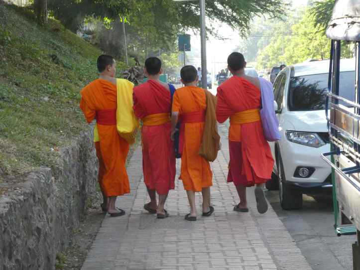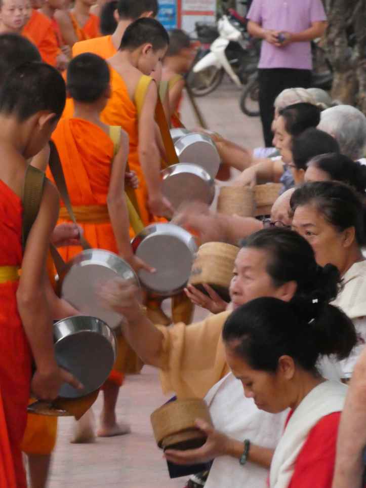 It has also become a tourist attraction. Vendors will sell rice to people who want to participate. Hotels put out mats and provide rice for tourists. Other tourists arrive by vans will that deposit them at the right spot at the right time so they don’t have to wait. They jockey for position to try to get the money shot of the monks receiving alms. Some tourists watch from a distance using their zoom, while others sit quietly.