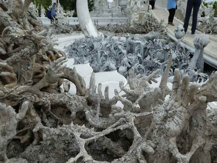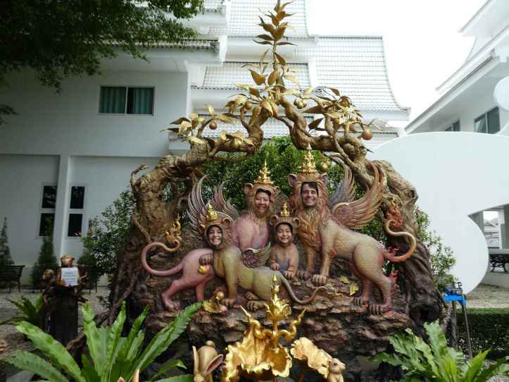 Aside from the crowds, and multiple ways of donating or spending money in the complex, there were ongoing art projects big and small around the property: A monster with two mouths and five eyes, a massive fountain with bells under waterfalls made up of many faces, a sculpture of griffins wearing traditional Siamese royal headdress where we could put our faces, and giant serpent-dragon fountains. It was difficult to tell where the temple began and the artistic-theme-park ended. “I wonder what this place will look like in a hundred years,” asked Alyssa. It was a good question. It made me wonder if some of the temples we had seen at Angkor Wat, Prambanan, and Borobadur were also similar when they were constructed. Were they cutting edge renditions of what the elite class interpreted religion as? Part of me assumed not. The temples that stood the test of time were forged from durable materials taking substantial time and physical investment by large segments of the population. I would be surprised if this temple-theme-park-art-project will stand the way it is now in 500 years. It looks new, shiny, and interesting….but it also looks fragile.