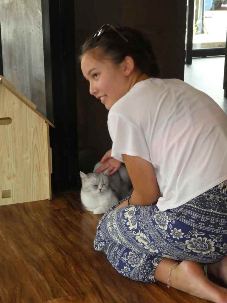 Kylie and Alyssa loved this place! A small cafe, with floor seating, small tables, and a room full of cats. They walked everywhere. They setup shop on your table. They even tried to eat the food of the inattentive or distracted customer. Cats slept and walked on catwalks above. They rested in and on cat hotels. They lounged on furniture all around. Many of these entitled cats walked around avoided kids trying to pet them. However, Kylie worked hard with one, and by the end of our visit had it purring with appreciation.