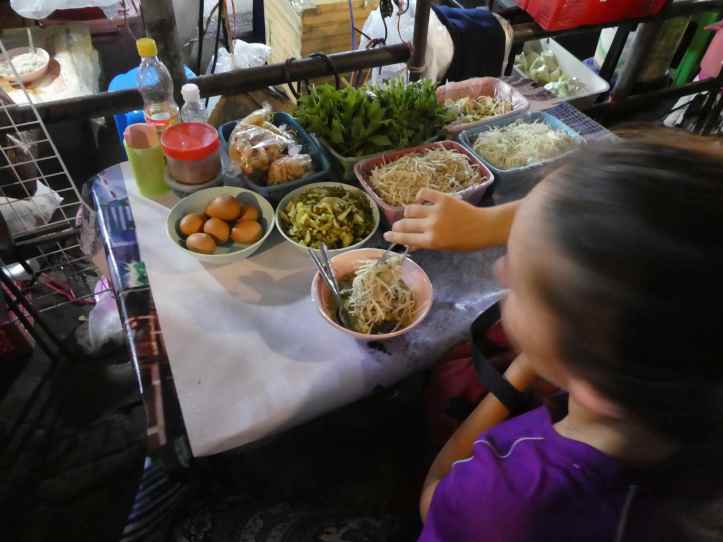At night, push cart food stalls and tables went up, serving more delicious food. Alyssa and Sharleen could not get enough of the curried noodle soap. I was pretty happy with the Pad Sew Ew. Kyle was the most adventurous, sampling different foods many times.