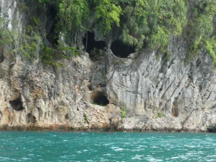 The lake was filled with stunningly turquoise limestone mineral enriched fresh water. We took a 45 minute boat ride to the floating bungalows near Nam Ta Lu Cave. The scenery was stunning. However after seeing the karst formations in Lan Ha Bay Vietnam, Shilin China, Trang An Vietnam, and Mulu Borneo, they were not as new and amazing. In fact some call this area the Guilin of Thailand in reference to Guilin china. The erosion and staining over the years make patterns in the cliffs and when looking hard enough, amazing things may appear. Osprey and sea eagles perched on many dead trees waiting for lunch below.