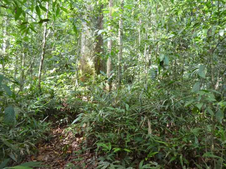 Later, I continued on the loop. After crossing the bridge, the trail climbs up to the 1,000 meters above sea level mark. and then down. There were various opportunities to take side paths, which I explored carefully. I heard wildlife all around, but the rainforest was dense and it was all well hidden. I did however find elephant dung that was a few days old as well as tree damage. I regularly heard gibbon monkeys calling in the trees. At one point I hiked off trail about 500 meters to listen to gibbons call from a tree above. I spend nearly 20 minutes just listening to them call and coo. I spent nearly six hours hiking through this forest. I could have spent a lot more.
