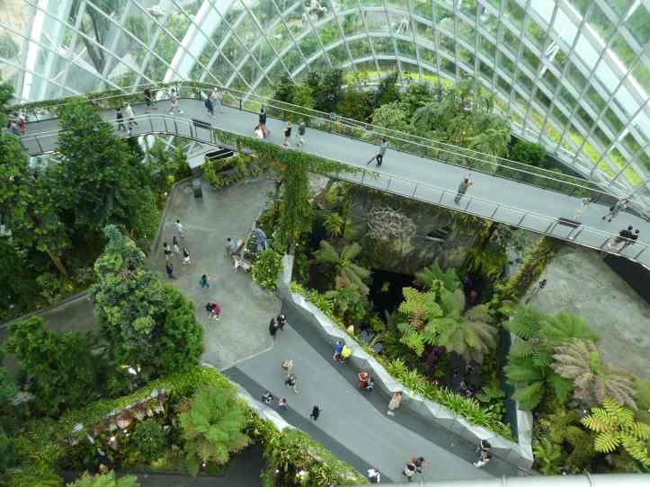 Next to the Flower Dome is a Cloud Forest within another dome. Upon entry we were overwhelmed by a huge waterfall cascading down an artificial mountain dense with cloud forest flora and fauna. As we worked our way up the levels to the top we were dazzled by the numerous and diverse orchids, flowers, and plants. At every corner informational placards described either the flora and fauna, cloud forest ecosystems and climate, or informed us as to their uncertain future.