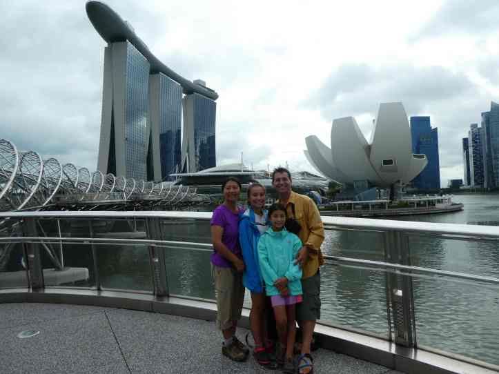 The ArtScience Museum by my left shoulder.  The double helix bridge we had to cross by Sharleen’s right shoulder.  The Marina Bay Sands Resort in the back ground.