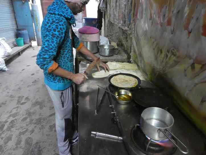 One of Cafe Sona’s chef’s preparing aloo paratha. A pinch of potato and spices are put in a piece of dough, rolled on the surface, then cooked on a hot plate.