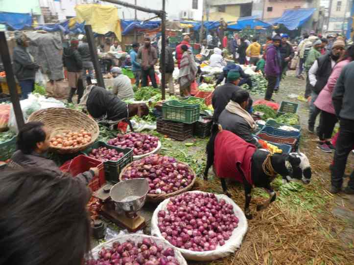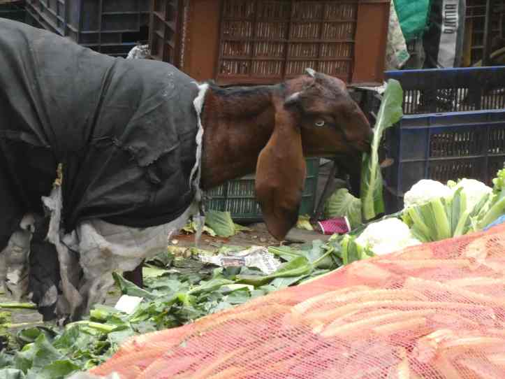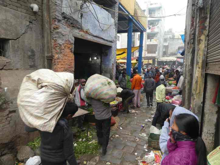 All food was in baskets, or spread out on burlap or plastic tarps as people haggled for deals and stuffed bunches of every kind of vegetable into their bags. In the middle of the whole show a small band of renegade goats crashed through the market sampling vegetables from each vendor. Most vendors tried to shoo them away while others just let the goats have their fill. “Keep away, they are very dangerous” one person told us. The goats were clothed in Delhi’s cold whether, so clearly someone owned them; however no one seemed to be able to control them in the market.