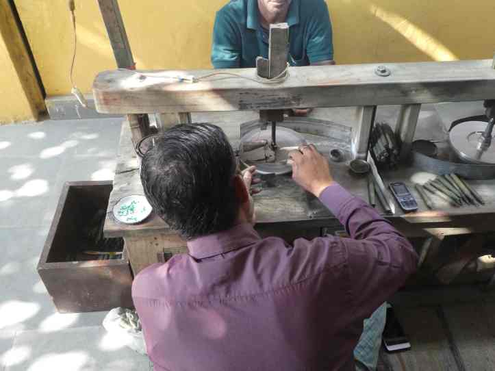 Like most tourists we were afforded the opportunity to see a “good friend” who was in the gemstone business. Jaipur is famous for their gemstones and jewelry. The Mughal Emperors used the artisans in the area to fashion their pieces. Consequently generations of jewelry artisans populate the area. Our guide (and salesperson) stated: “We have over 300 families making jewelry in this area, I am a 5th generation jeweler.” He gave a quick tour of how they grind stones to Alyssa and Kylie, but then moved in for the hard sell.