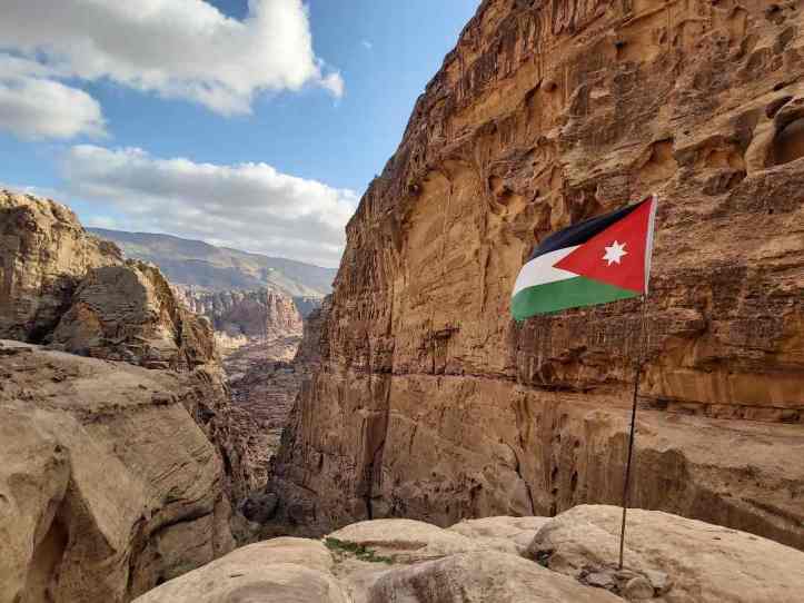A view down a side canyon on the Al Deir trail. The blue skies provided a rich contrast to the sandstone coloring below. The Jordanian flag flies sporting a seven point star representing faith in one God, humanity, humility, national spirit, virtue, social justice, and aspiration. Jordan has been a pillar of peace in a dangerous neighborhood for a very long time.