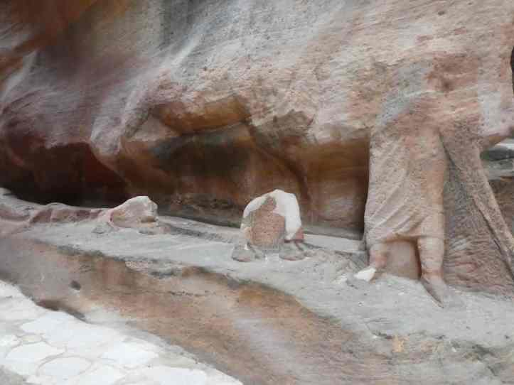 What is left of a statue of a trader followed by camels laden with goods such as frankincense and myrrh. There were several of these along the Siq indicating Petra’s wealth and importance in trade. However only this one remains recognizable. Not bad for 2000 years plus of wear and tear.
