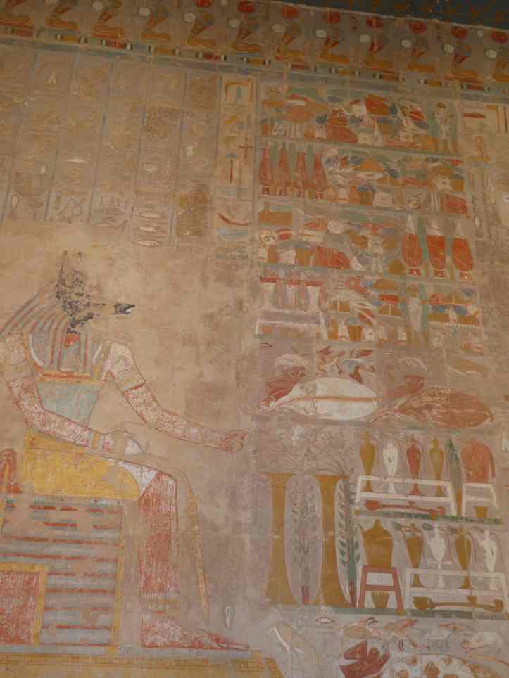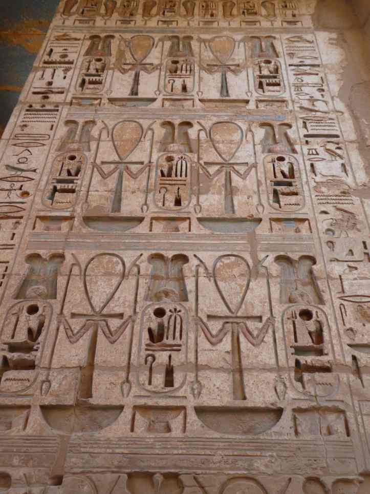 We went the Valley of the Kings first. There are nearly 20 tombs to choose from, your ticket will allow you entry to 3. Some tombs like Tutankhamen and Seti cost extra. Do research in advance (especially if you don’t have a guide) to determine which tombs you want to enter as you don’t want to waste time trying to figure out which one you want. All tombs have a placard in front describing the significant elements of each tomb. We budgeted 90 minutes, but were there for two hours because we couldn’t decide which tombs to enter. The trolley ride costs 4EGP per person and it takes you only 200 meters. Think about how you will document your trip. You will either get forced to check your camera, pay a fee to take it in, or bribe the guards. The intent behind this originally was that flashes harm the hieroglyphs; however it is now: phones ok and cameras are not. Everyone and their mother had their cellular devices taking pictures and videos with flashes and the guards only got angry over cameras. They were of course open to overlooking such transgressions for a lot of backsheesh.