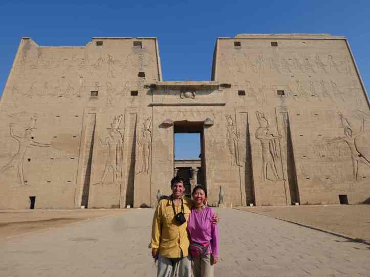 Kom Ombo, Edfu, and Esna are all South of Luxor. Some people take trains or buses to and from. Others ride riverboats South and stop at each site along the way. We took a two day felucca ride to Kom Ombo and hire a car to Edfu and Esna, and then to our residence in Luxor. This took 8 hours and excluded time at Kom Ombo as we viewed it the night before. We spent nearly 90 minutes in Edfu and Kom Ombo, and 45 minutes in Esna.