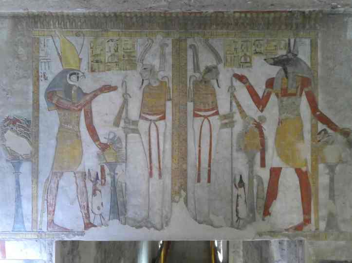 We had to choose three tombs to go into. Unfortunately we did not do our research beforehand and had to guess once we got there. There were a lot of groups going into the tombs and the tombs closer to the entrance were significantly more crowded. We went to Ramses III, then Twosret/Sethnakht (the farthest away), and then Merenptah which had a steep descent. We were not disappointed. The walls were colored brilliantly with hieroglyphs and spells from the book of the dead. One tomb had two empty coffins, and the rest were barren except for what was on the walls.