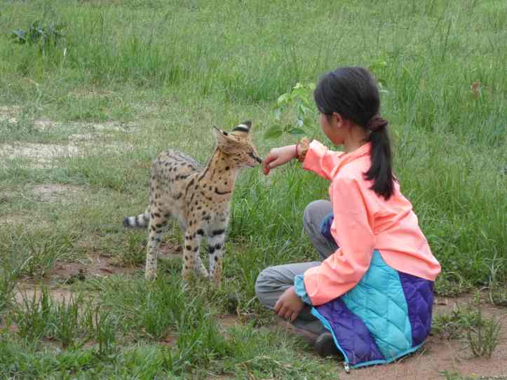 A serval cub was orphaned so IMIRE took her in. After keeping her in an enclosure for a short time they released her. She hunted every evening eating various insects and birds. She is currently seven months old. She often came back to visit and for some loving, before wandering off again. Servals are hard to see in the wild as they are night time predators. We were so lucky to see and interact with one. Vera and Sam think that as she gets closer to maturity, she will disappear from the camp to rear her cubs. Time will tell if she returns. But for the week we were there, she graced us with her presence every day!