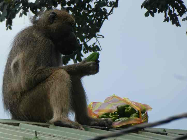 Our shuttle from the airport dropped us off at the Zimbabwe border and we had to walk across. Lines of trucks waited to cross the bridge two at a time from one side, then the other. The border crossing from Zimbabwe to Zambia was legendary. Spray from Victoria Falls rose like smoke from a fire creating mist everywhere. From the narrow bridge there was bungee jumping and zip lines on one side. The other sported amazing views of the falls. We still had all our gear and after crossing the bridge the immigration office had taxis, baboons, and salespeople who all wanted our attention, money, and stuff.