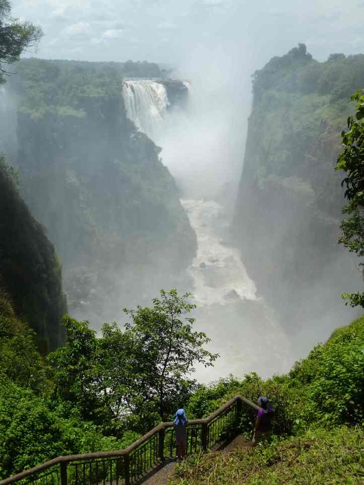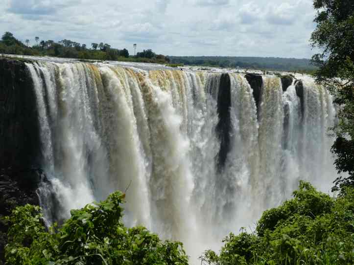 Mosi-oa-Tunya (The smoke that thunders) was what Victoria Falls was called in the local language. It was an UNESCO World Heritage Site. At over 108 meters high and two kilometers long it is the largest sheet of falling water in the world. It is twice as high and well over twice as long as Niagra falls. Iguazu Falls in South America is a little longer, but not as high. Iguazu also has a much higher volume of water rushing over it. Livingstone island lies on the precipice in the middle of the Falls. Only crazy people go out there. In the days of Livingstone, skilled boatmen used dugout canoes to get there. We boarded a dual engine speed boat that navigated the swift currents and hippos to get to the island.