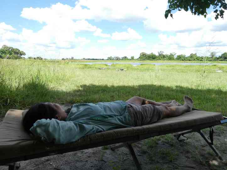 Rosemary’s comments about the morning walk were the best: “I did not trust Jonah at all. That man didn’t have a gun, not even a stick.” Being from Kenya, their walking safaris usually have a ranger with a gun. We were really exposed, but no one’s been killed yet, and we made it. Jonah explained that he and his people have been living with animals in the delta for a long time. “Depending on the animal and the situation we do different things. Sometimes we stay still, sometime hide behind a tree or rock, it all depends on the animal and the situation.” It all sounded very reasonable. Fortunately, we never had to put it to the test.