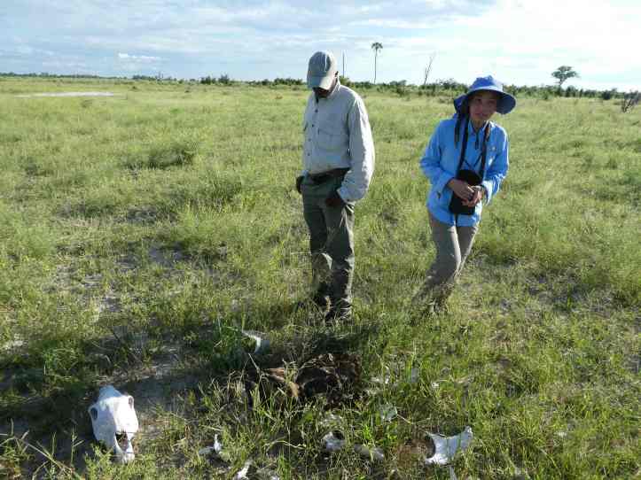 We started off into the bush. We walked through the shrubs and the land opened into grasses and reeds. Hippos grunted in the background while Jonah showed us buffalo and giraffe tracks. There was plenty of elephant dung and antelope tracks as well. We came across the carcass of a juvenile giraffe. From time to time, Jonah would stop and look through the binoculars.