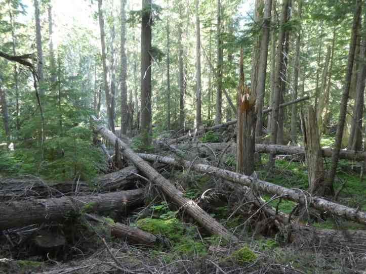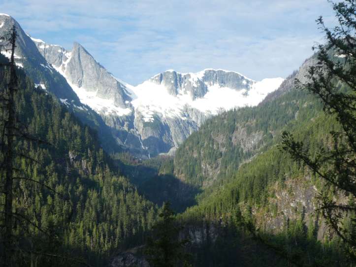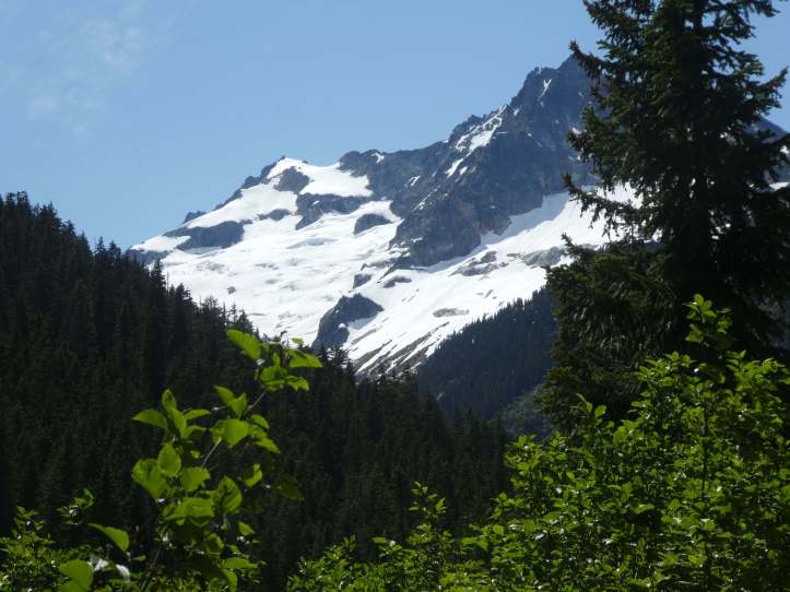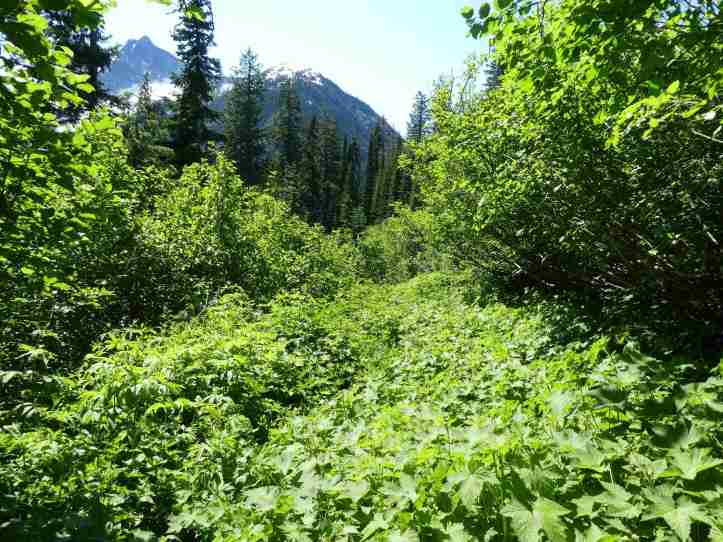 Along the Thunder Creek Trail, at every glimpse through the forest canopy I saw snowy mountaintops, crags, and steep tree covered slopes. Each slope boasted a mix of waterfalls and avalanche scars in different stages of recovery.
